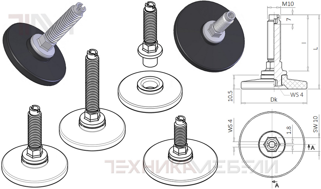 Поставляется: с черным пластиковым подпятником (полиамид PA6). Допустимая нагрузка на опору ~254 кг.